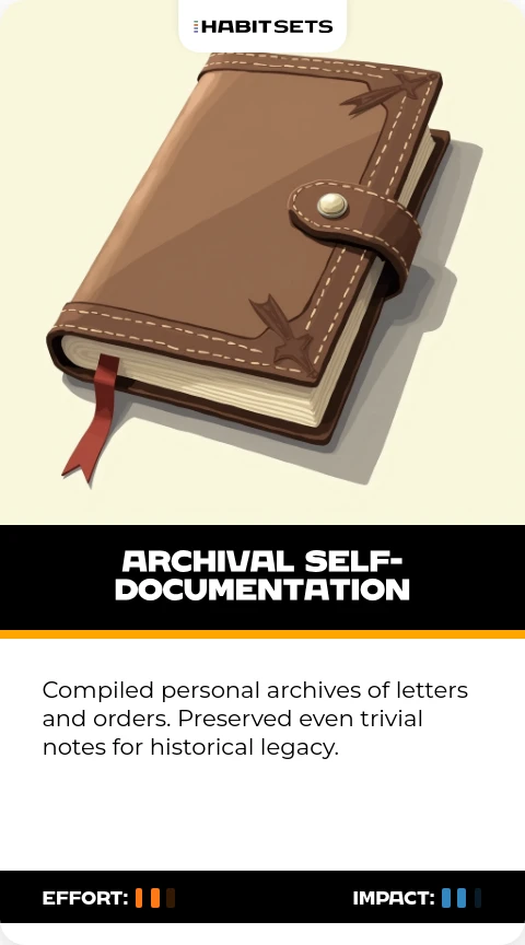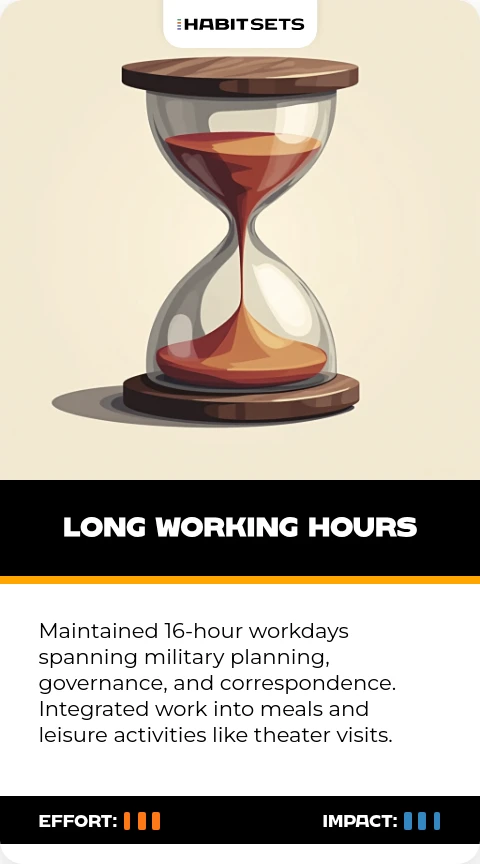 Maintained 16-hour workdays spanning military planning, governance, and correspondence. Integrated work into meals and leisure activities like theater visits.