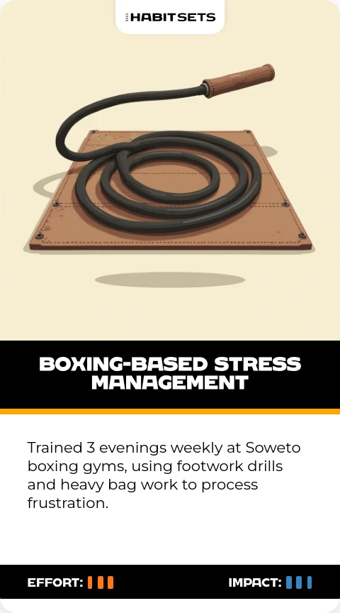 Trained 3 evenings weekly at Soweto boxing gyms, using footwork drills and heavy bag work to process frustration.