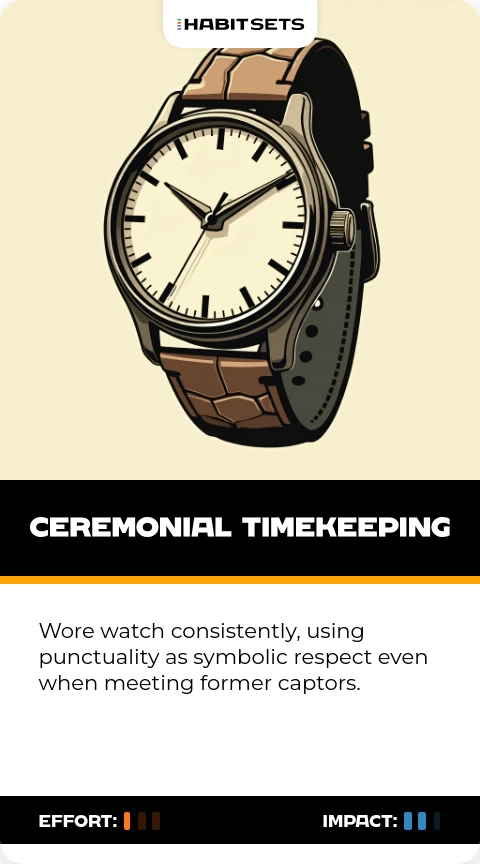 Wore watch consistently, using punctuality as symbolic respect even when meeting former captors.