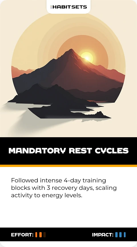Followed intense 4-day training blocks with 3 recovery days, scaling activity to energy levels.