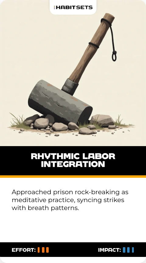 Approached prison rock-breaking as meditative practice, syncing strikes with breath patterns.