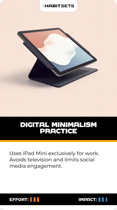 Uses iPad Mini exclusively for work. Avoids television and limits social media engagement.