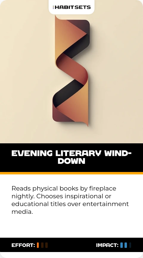 Reads physical books by fireplace nightly. Chooses inspirational or educational titles over entertainment media.