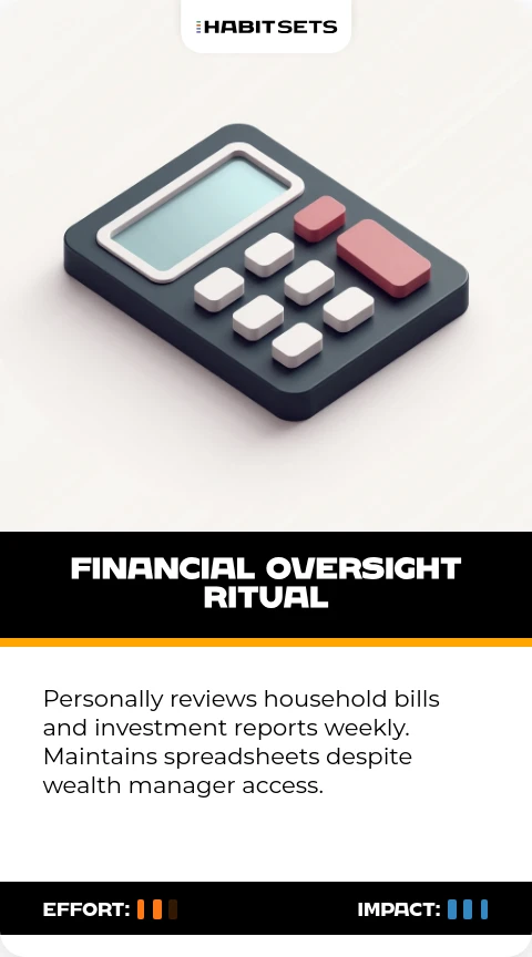 Personally reviews household bills and investment reports weekly. Maintains spreadsheets despite wealth manager access.