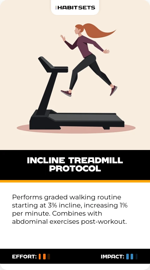 Performs graded walking routine starting at 3% incline, increasing 1% per minute. Combines with abdominal exercises post-workout.