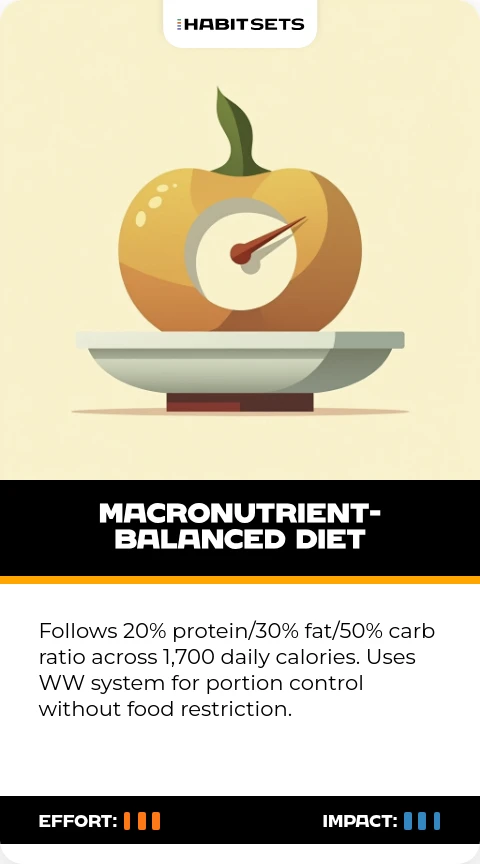 Follows 20% protein/30% fat/50% carb ratio across 1,700 daily calories. Uses WW system for portion control without food restriction.