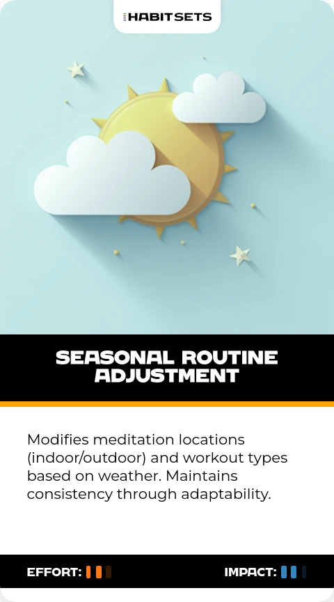 Modifies meditation locations (indoor/outdoor) and workout types based on weather. Maintains consistency through adaptability.