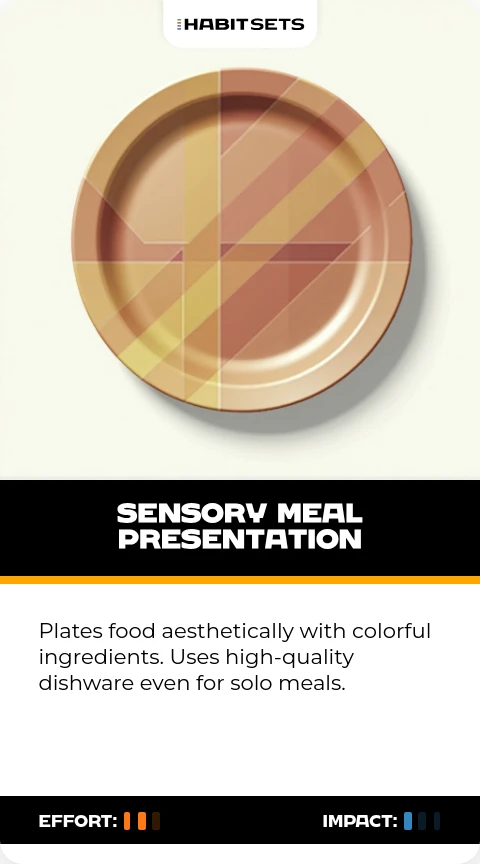 Plates food aesthetically with colorful ingredients. Uses high-quality dishware even for solo meals.