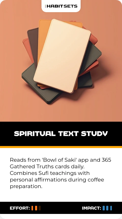 Reads from 'Bowl of Saki' app and 365 Gathered Truths cards daily. Combines Sufi teachings with personal affirmations during coffee preparation.