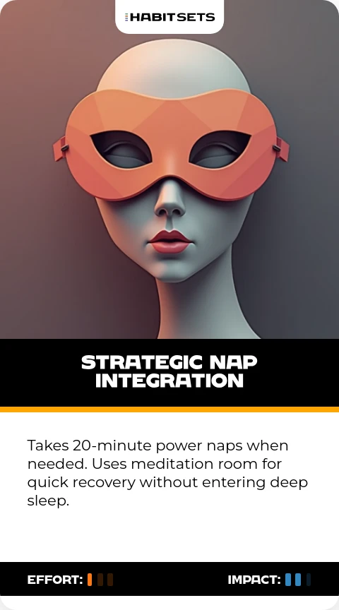Takes 20-minute power naps when needed. Uses meditation room for quick recovery without entering deep sleep.