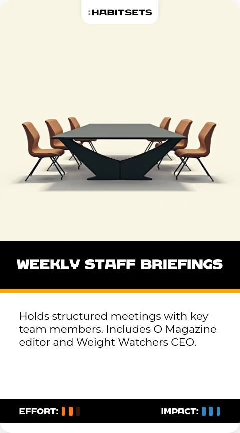 Holds structured meetings with key team members. Includes O Magazine editor and Weight Watchers CEO.