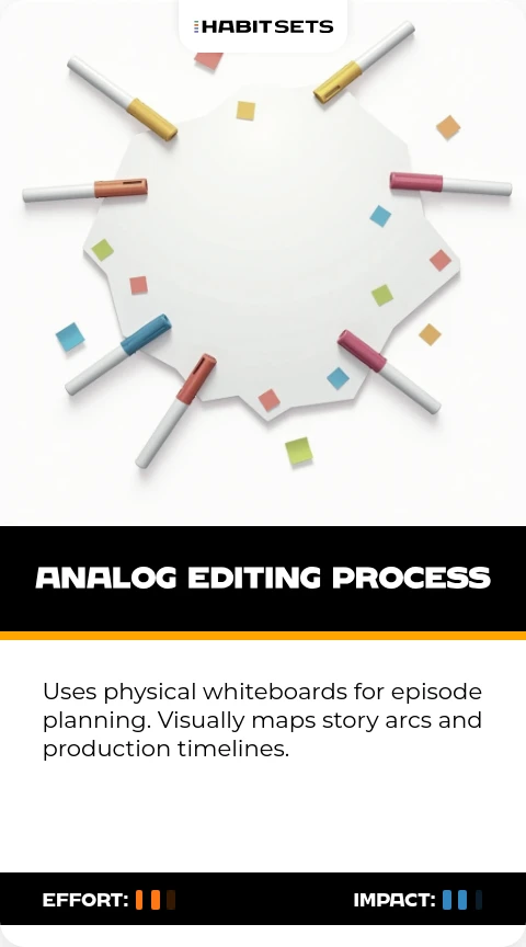 Uses physical whiteboards for episode planning. Visually maps story arcs and production timelines.