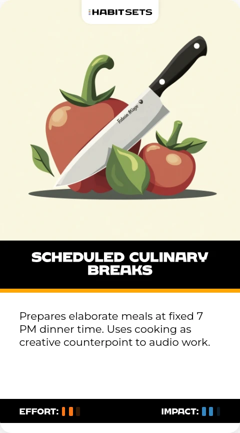 Prepares elaborate meals at fixed 7 PM dinner time. Uses cooking as creative counterpoint to audio work.