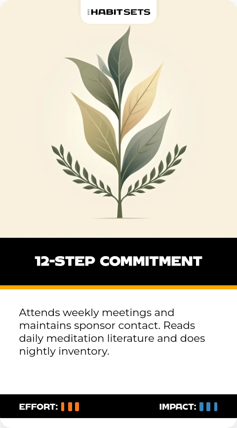 Attends weekly meetings and maintains sponsor contact. Reads daily meditation literature and does nightly inventory.