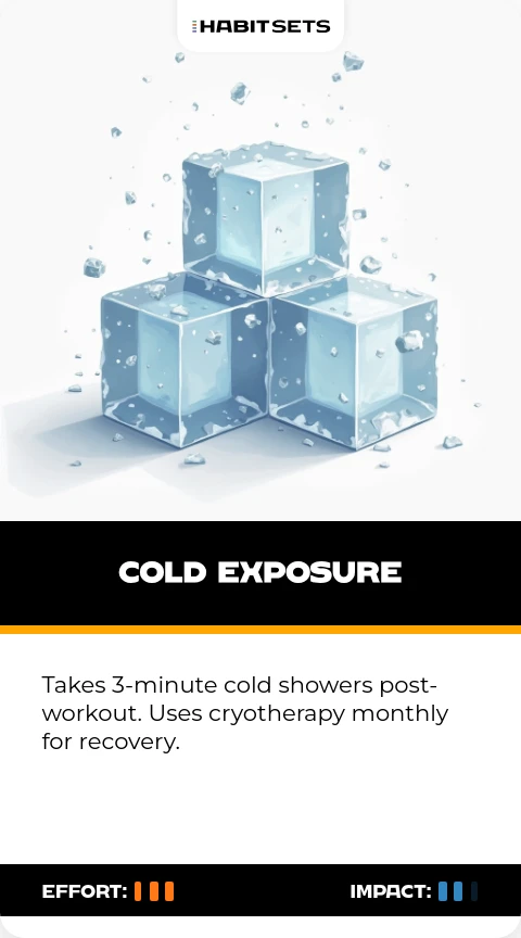 Takes 3-minute cold showers post-workout. Uses cryotherapy monthly for recovery.