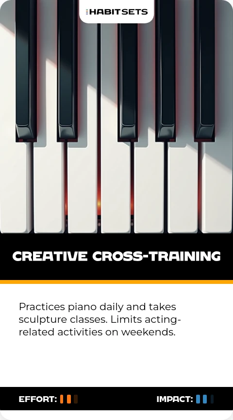 Practices piano daily and takes sculpture classes. Limits acting-related activities on weekends.