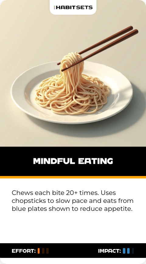 Chews each bite 20+ times. Uses chopsticks to slow pace and eats from blue plates shown to reduce appetite.
