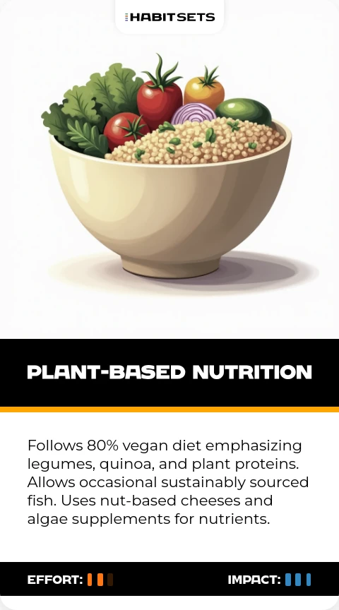 Follows 80% vegan diet emphasizing legumes, quinoa, and plant proteins. Allows occasional sustainably sourced fish. Uses nut-based cheeses and algae supplements for nutrients.