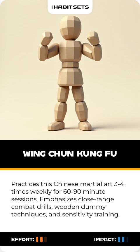 Practices this Chinese martial art 3-4 times weekly for 60-90 minute sessions. Emphasizes close-range combat drills, wooden dummy techniques, and sensitivity training.