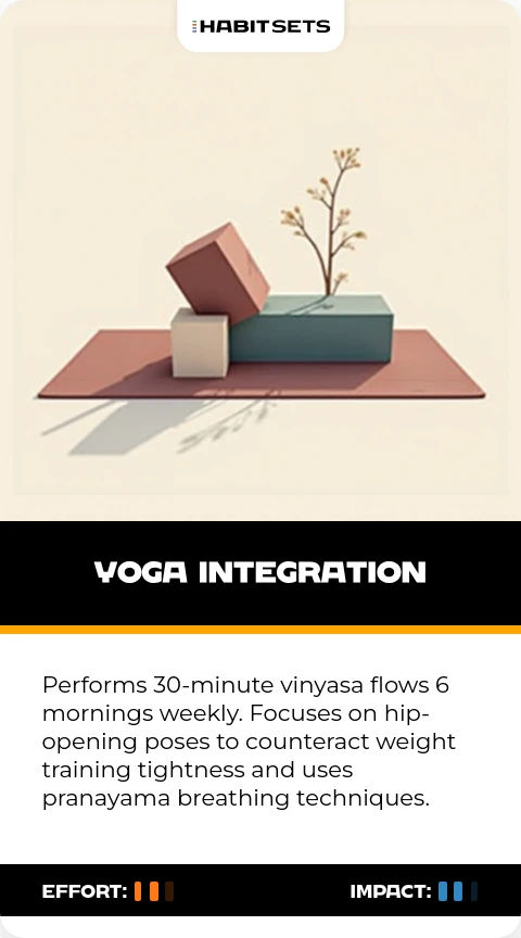 Performs 30-minute vinyasa flows 6 mornings weekly. Focuses on hip-opening poses to counteract weight training tightness and uses pranayama breathing techniques.
