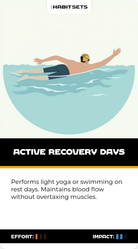 Performs light yoga or swimming on rest days. Maintains blood flow without overtaxing muscles.