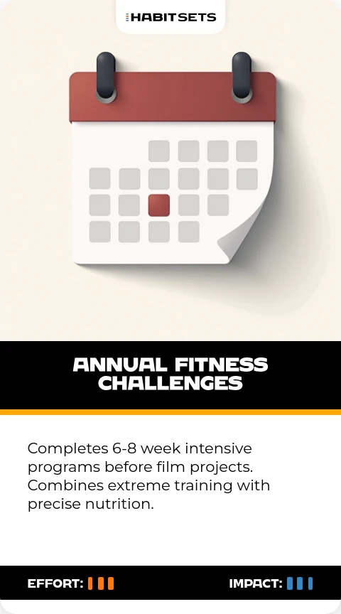Completes 6-8 week intensive programs before film projects. Combines extreme training with precise nutrition.