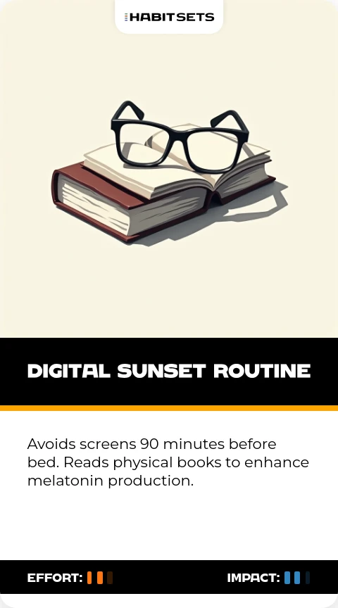 Avoids screens 90 minutes before bed. Reads physical books to enhance melatonin production.