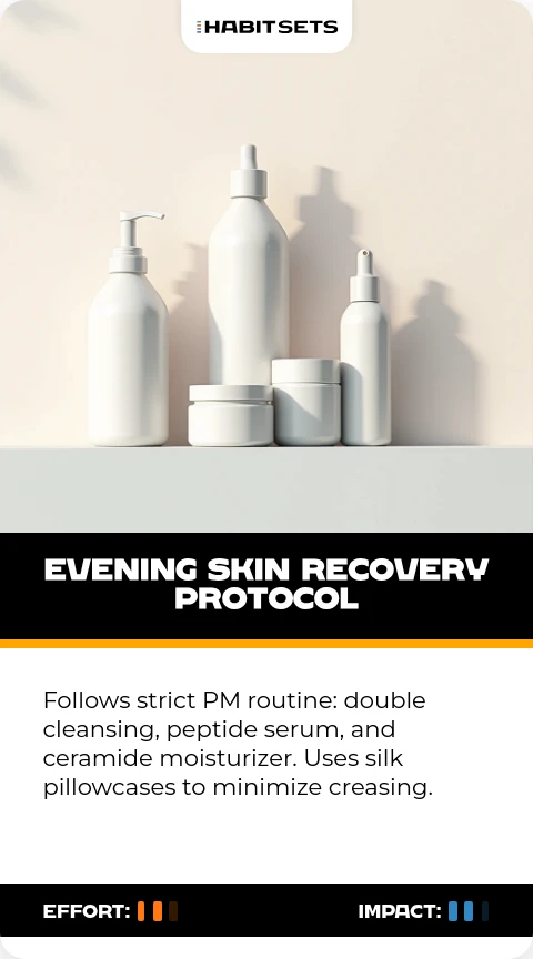 Follows strict PM routine: double cleansing, peptide serum, and ceramide moisturizer. Uses silk pillowcases to minimize creasing.