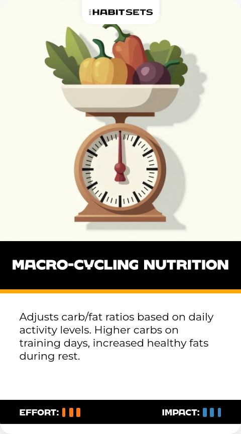 Adjusts carb/fat ratios based on daily activity levels. Higher carbs on training days, increased healthy fats during rest.
