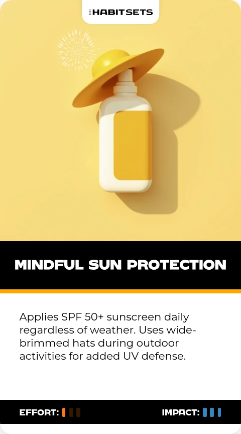 Applies SPF 50+ sunscreen daily regardless of weather. Uses wide-brimmed hats during outdoor activities for added UV defense.