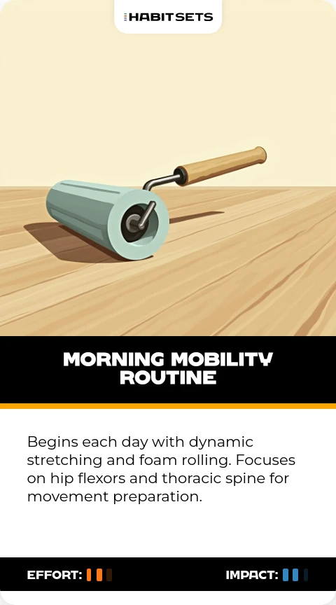 Begins each day with dynamic stretching and foam rolling. Focuses on hip flexors and thoracic spine for movement preparation.