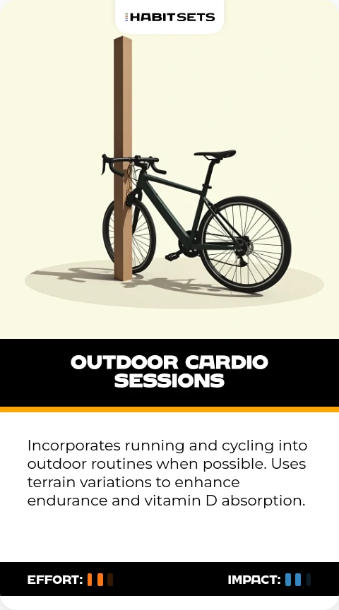 Incorporates running and cycling into outdoor routines when possible. Uses terrain variations to enhance endurance and vitamin D absorption.