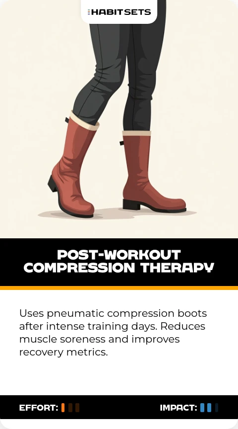 Uses pneumatic compression boots after intense training days. Reduces muscle soreness and improves recovery metrics.