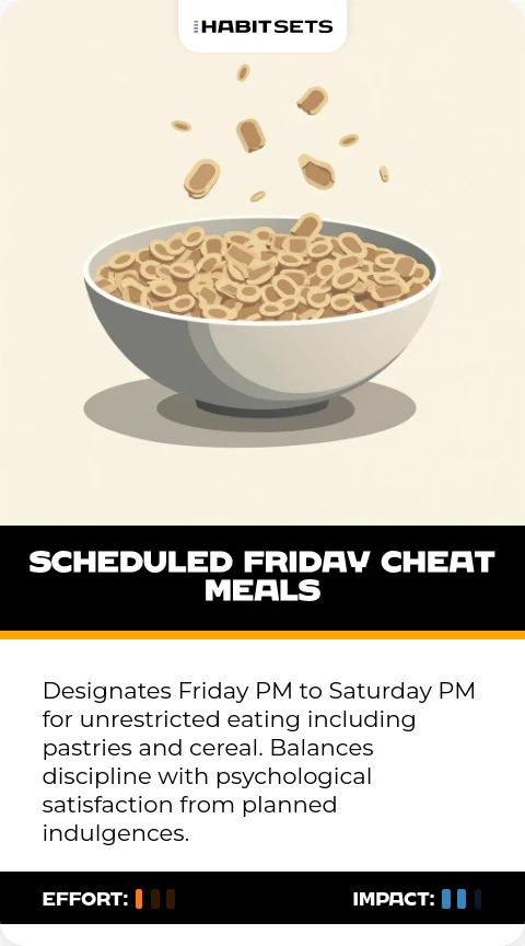 Designates Friday PM to Saturday PM for unrestricted eating including pastries and cereal. Balances discipline with psychological satisfaction from planned indulgences.