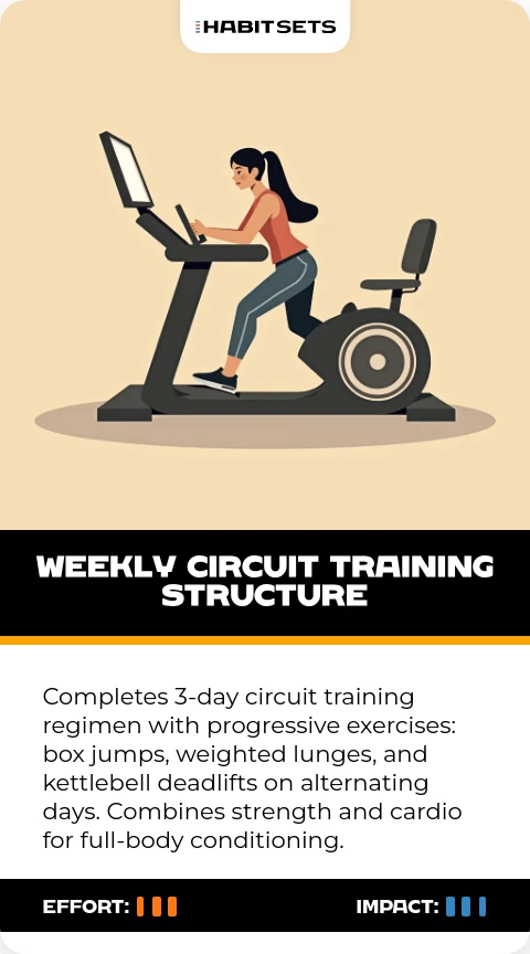 Completes 3-day circuit training regimen with progressive exercises: box jumps, weighted lunges, and kettlebell deadlifts on alternating days. Combines strength and cardio for full-body conditioning.