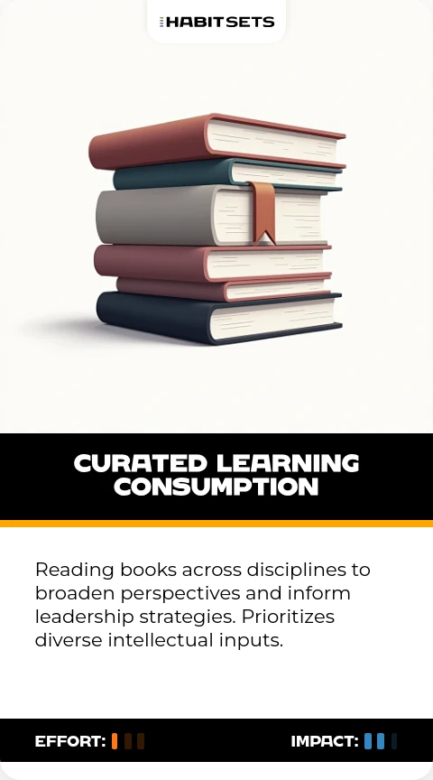 Reading books across disciplines to broaden perspectives and inform leadership strategies. Prioritizes diverse intellectual inputs.