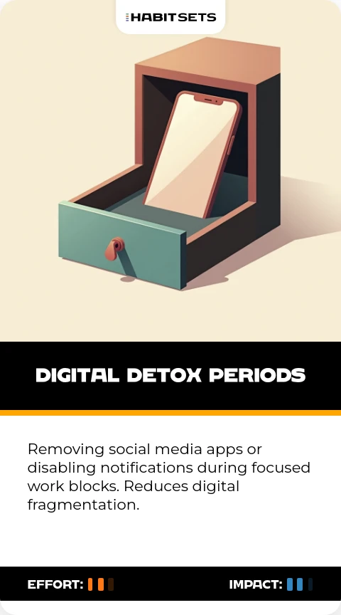 Removing social media apps or disabling notifications during focused work blocks. Reduces digital fragmentation.