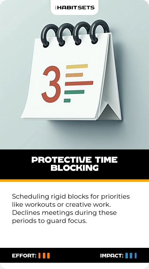 Scheduling rigid blocks for priorities like workouts or creative work. Declines meetings during these periods to guard focus.