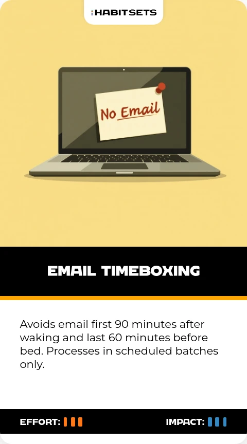 Avoids email first 90 minutes after waking and last 60 minutes before bed. Processes in scheduled batches only.