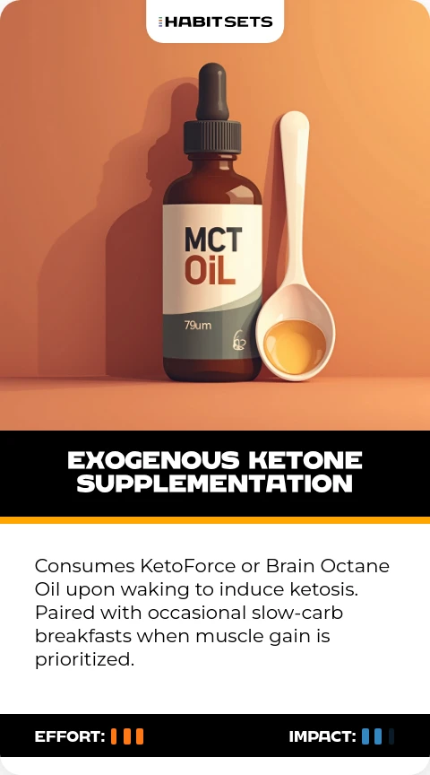 Consumes KetoForce or Brain Octane Oil upon waking to induce ketosis. Paired with occasional slow-carb breakfasts when muscle gain is prioritized.