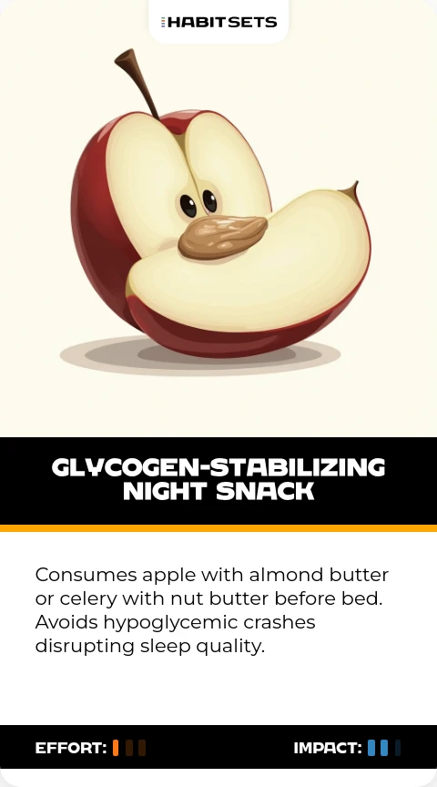 Consumes apple with almond butter or celery with nut butter before bed. Avoids hypoglycemic crashes disrupting sleep quality.