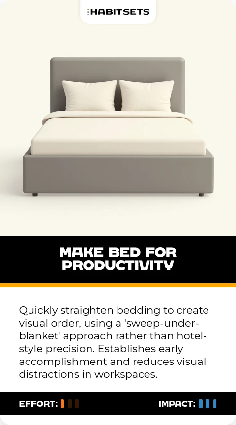 Quickly straighten bedding to create visual order, using a 'sweep-under-blanket' approach rather than hotel-style precision. Establishes early accomplishment and reduces visual distractions in workspaces.