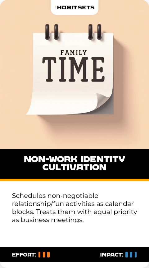 Schedules non-negotiable relationship/fun activities as calendar blocks. Treats them with equal priority as business meetings.