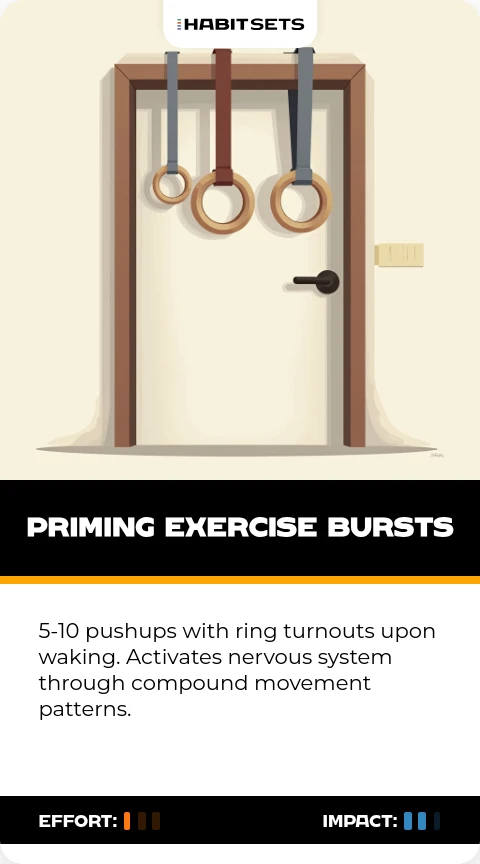 5-10 pushups with ring turnouts upon waking. Activates nervous system through compound movement patterns.