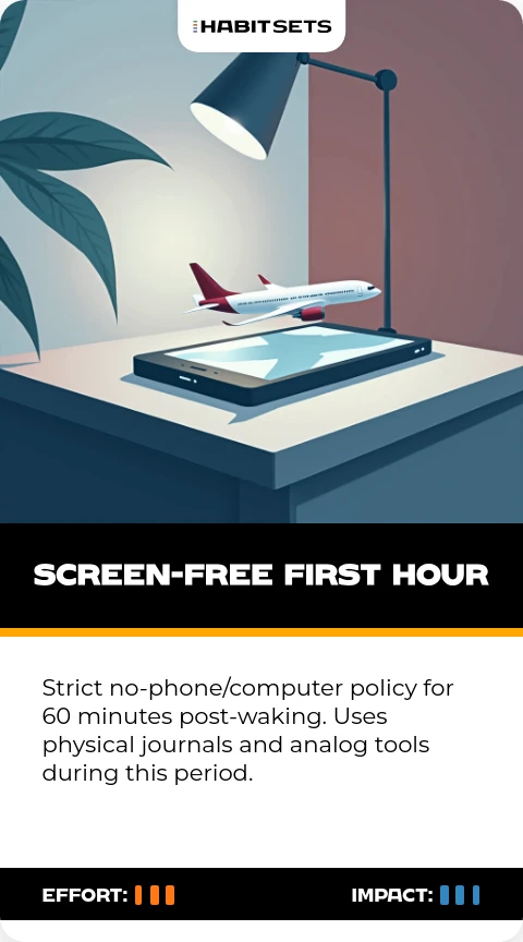 Strict no-phone/computer policy for 60 minutes post-waking. Uses physical journals and analog tools during this period.