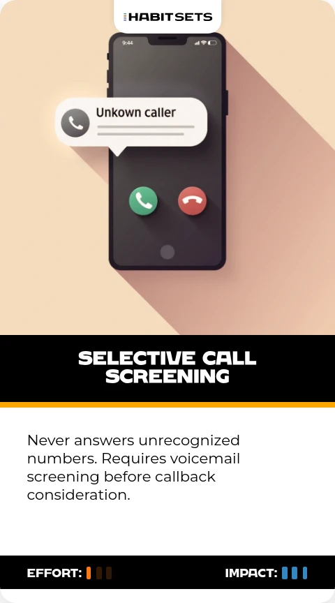 Never answers unrecognized numbers. Requires voicemail screening before callback consideration.