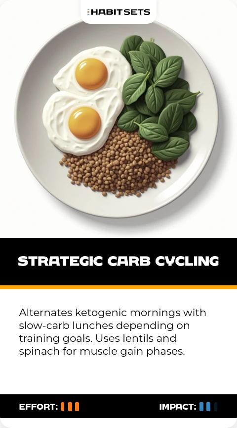 Alternates ketogenic mornings with slow-carb lunches depending on training goals. Uses lentils and spinach for muscle gain phases.