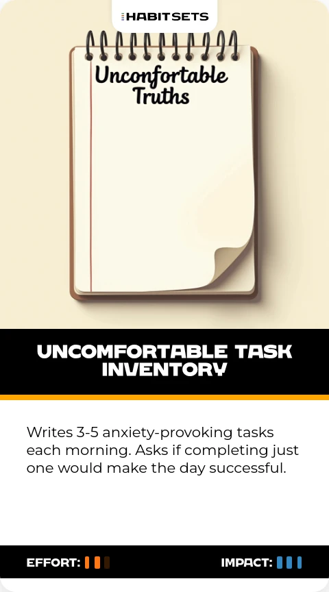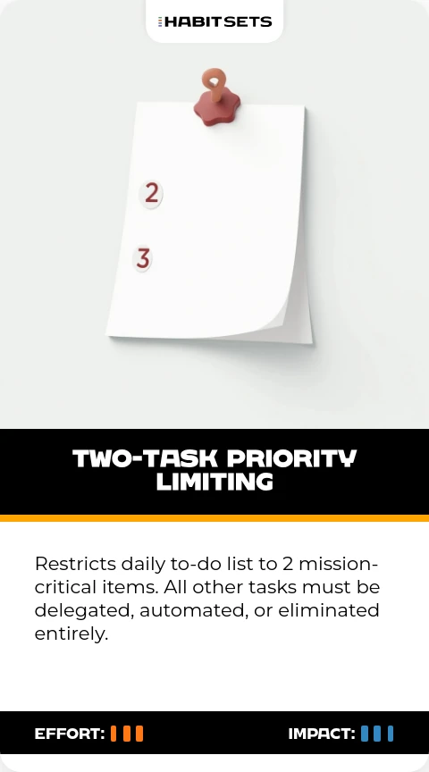 Restricts daily to-do list to 2 mission-critical items. All other tasks must be delegated, automated, or eliminated entirely.