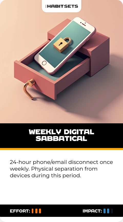 24-hour phone/email disconnect once weekly. Physical separation from devices during this period.