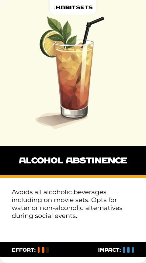Avoids all alcoholic beverages, including on movie sets. Opts for water or non-alcoholic alternatives during social events.